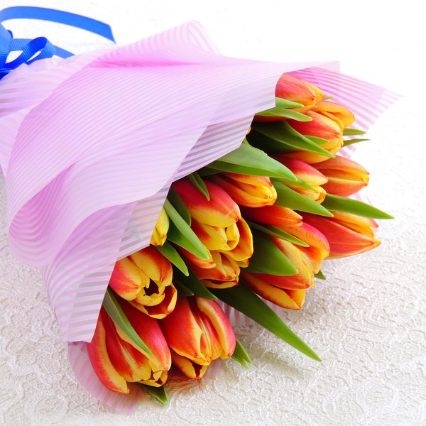Высота букета: 35 см Состав букета: Тюльпан красно-желтый: 11 шт. Упаковка: фетр, лента цветная.